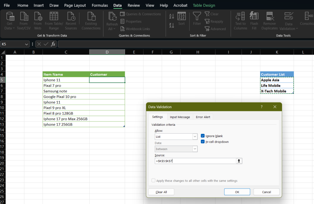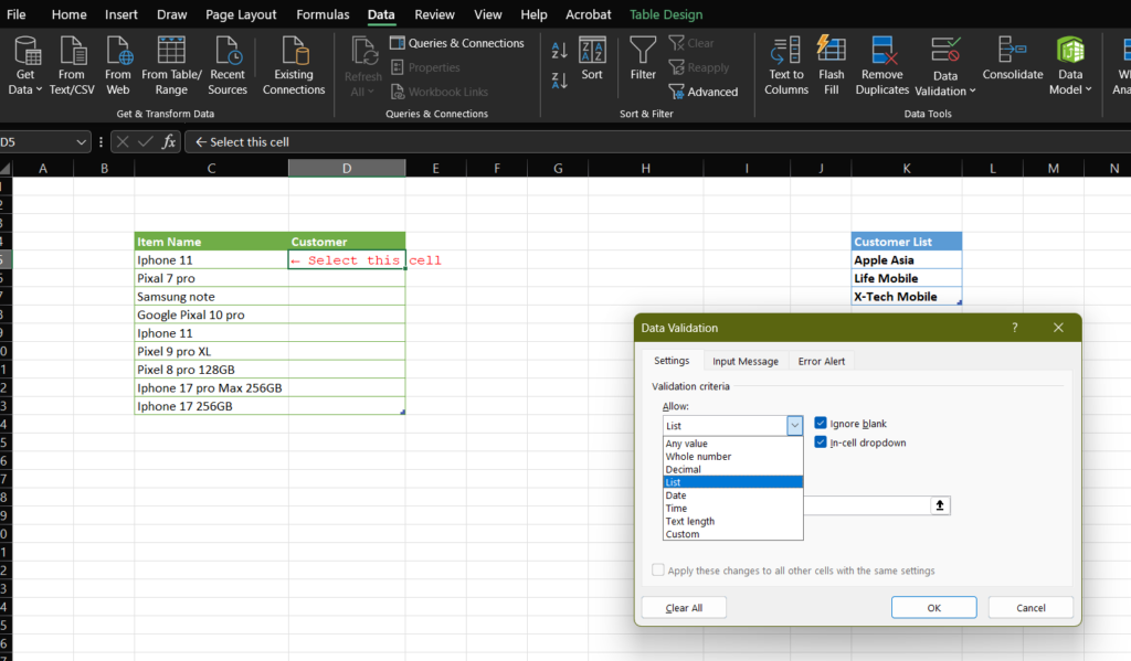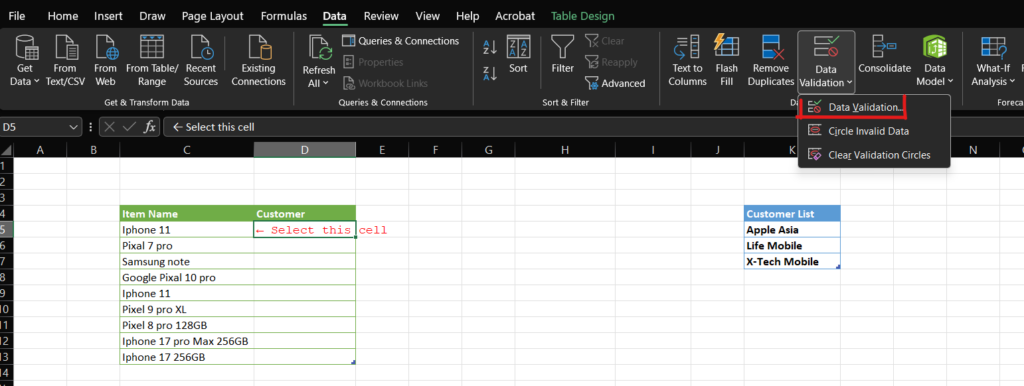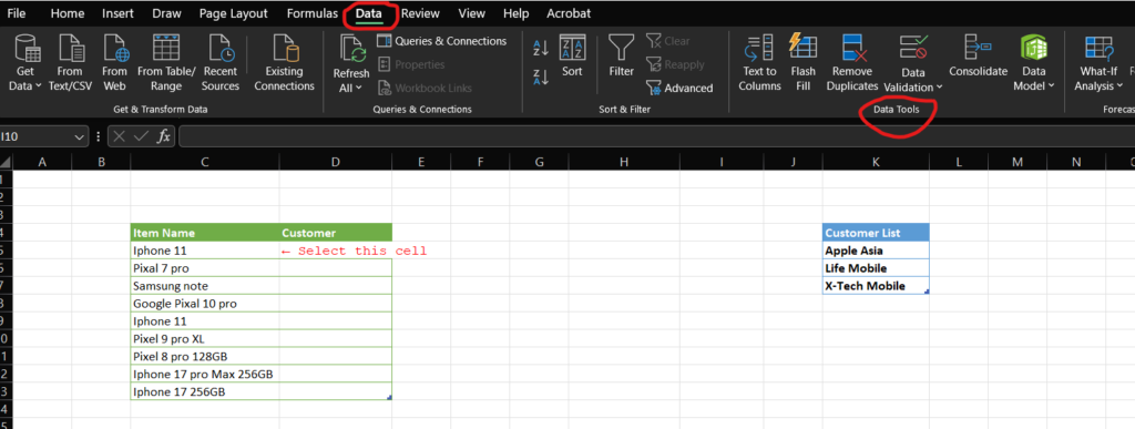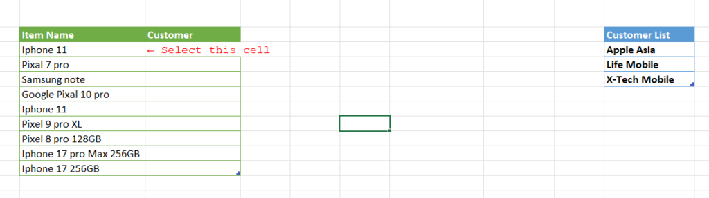 Select the cell where you want the drop-down list to appear. For example the “Customer Name” column.