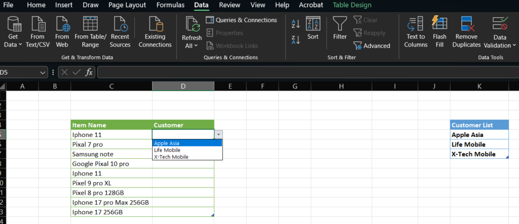 Select the cells that contain your customer names. Make sure you select only the data range. Do not include the cell where the drop-down list will appear. If you include that cell in the selected range, the drop-down will also appear in the list itself.